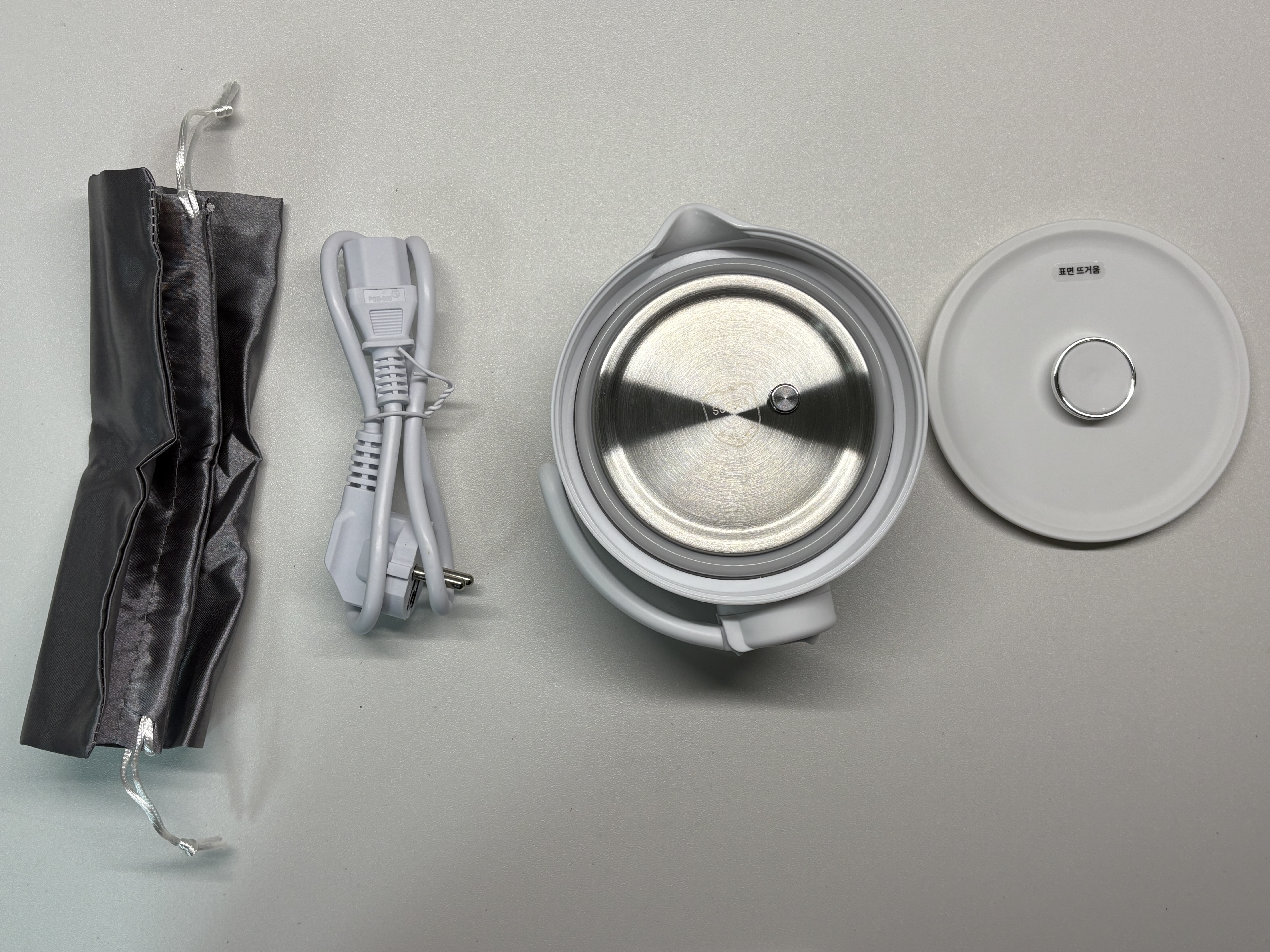 상자를 열고 포장지를 벗겨내면 파우치, 전원코드, 본품, 뚜껑 이렇게 구성되어 있음을 알 수 있습니다.