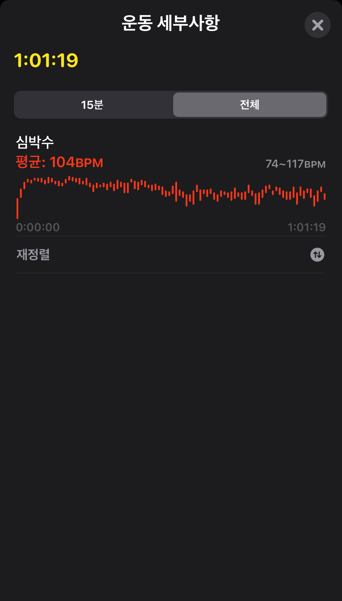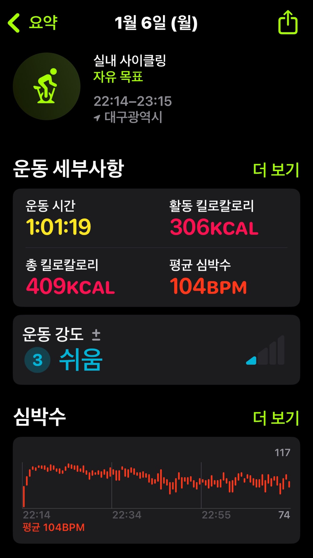 심박수는 평온하네요. 허벅지가 더 아프도록 타야 될까요? 그냥 1시간 채운 것으로 만족하면서 오늘 운동 완료했습니다.