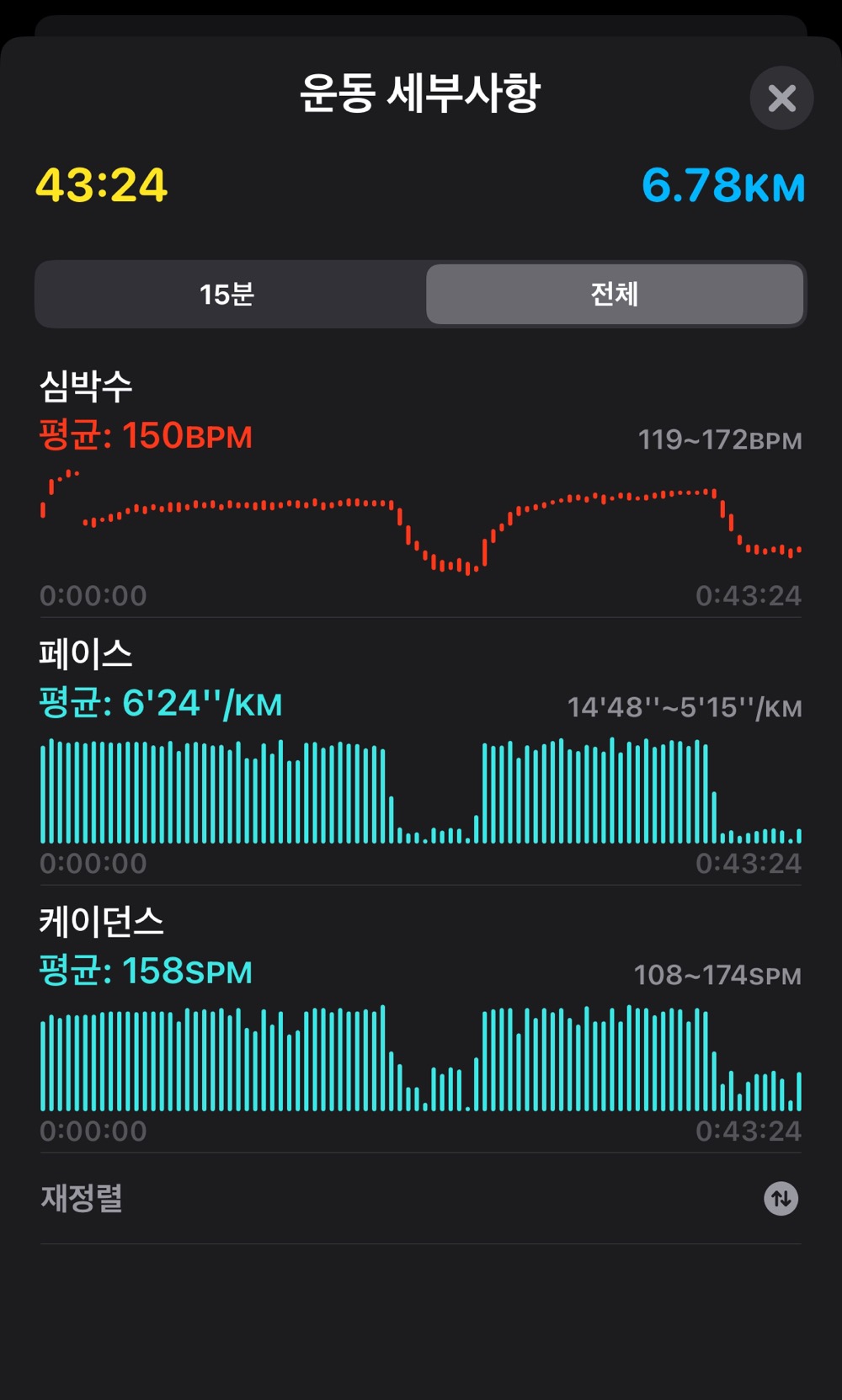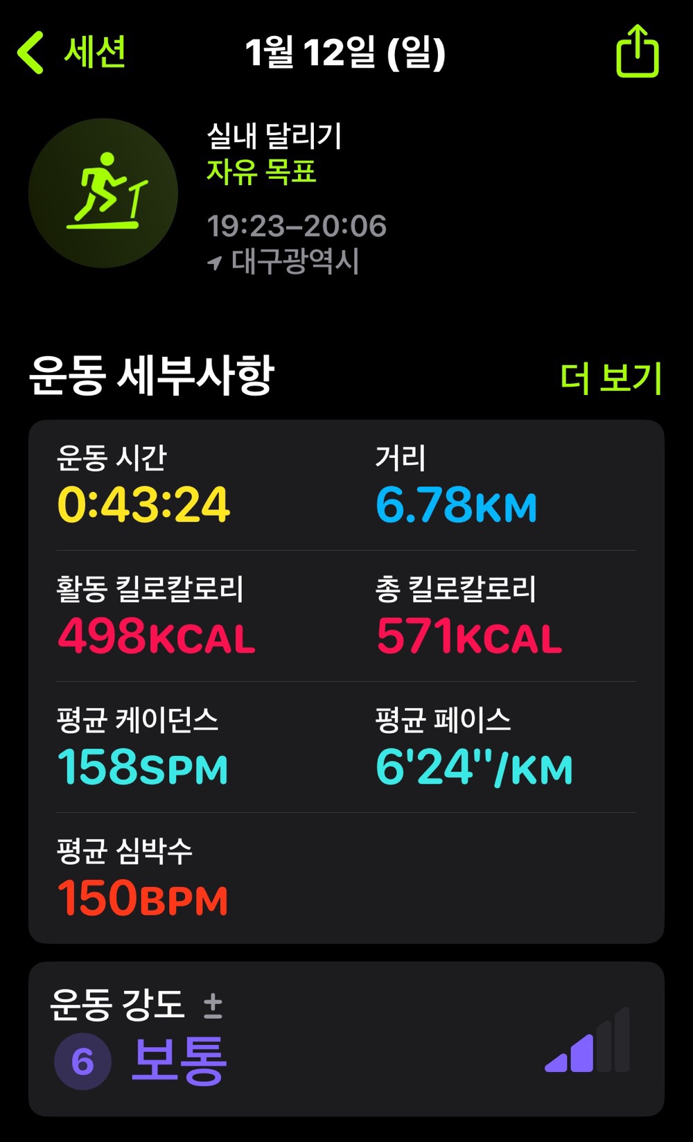 오늘은 트레드밀 기준으로 3키로 뛰고 5백미터 걷고 또 2키로 뛰고 5백미터 걷기 마무리로 총 6키로 운동했습니다. 근데 워치는 6.78km네요.