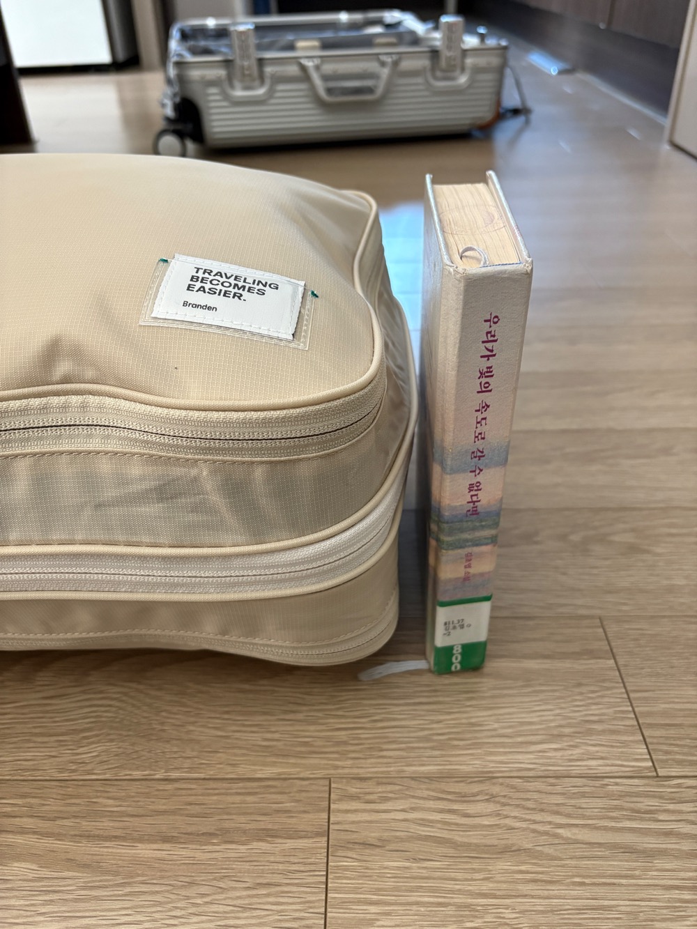 저는 반팔 티셔츠 9벌과 빈바지 4벌, 긴바지 2벌을 준비했습니다. 위의 비교사진 보이시나요? 책 보다 훨씬 높게 쌓여있던 옷들이 브랜든 압축 파우치에 넣으니 책과 거의 비슷한 높이로 들어갔습니다. 부피는 확실히 줄여지는 것을 알 수 있었습니다.