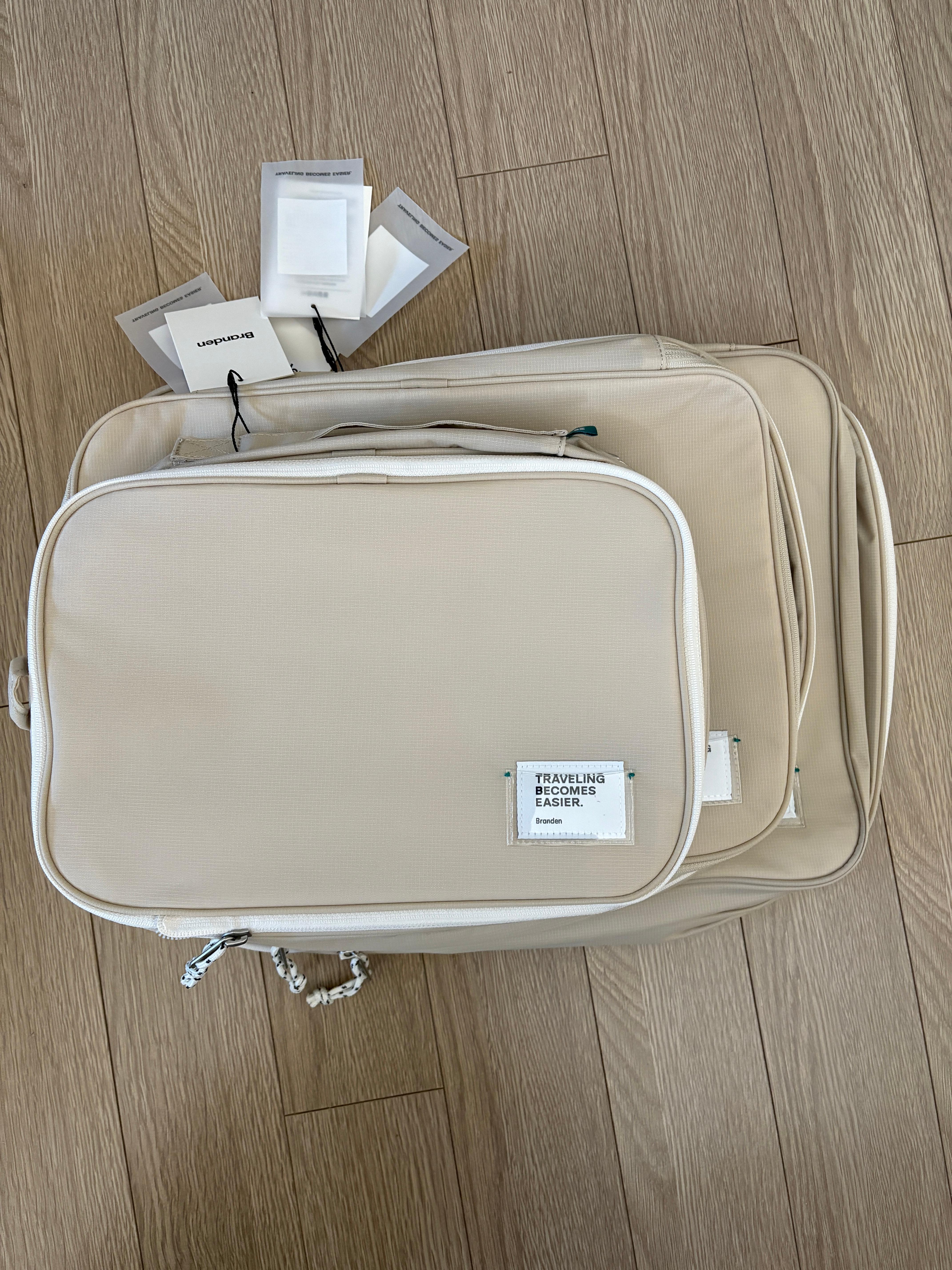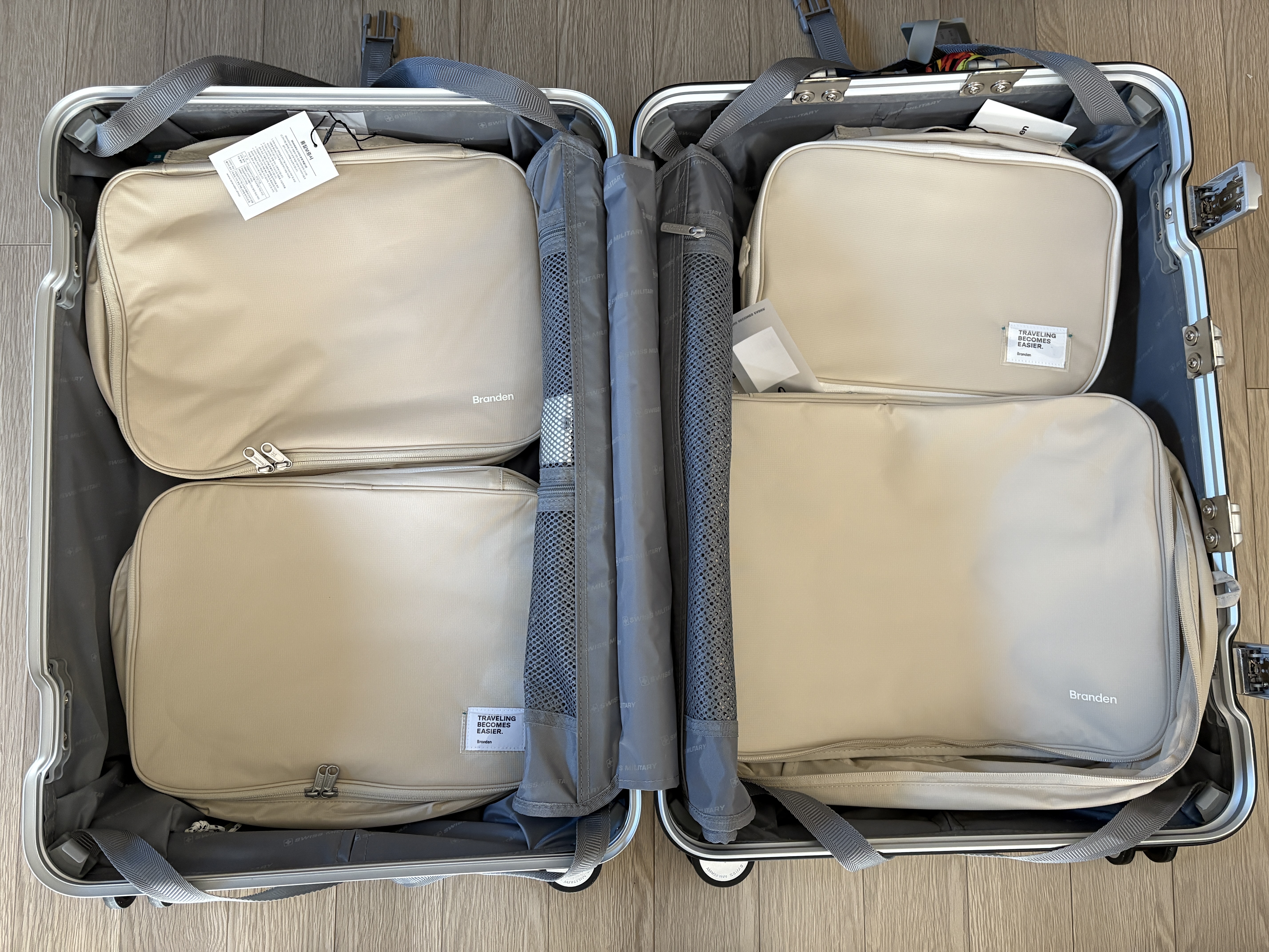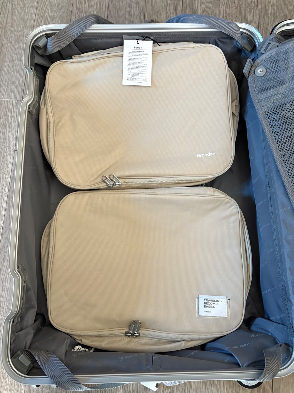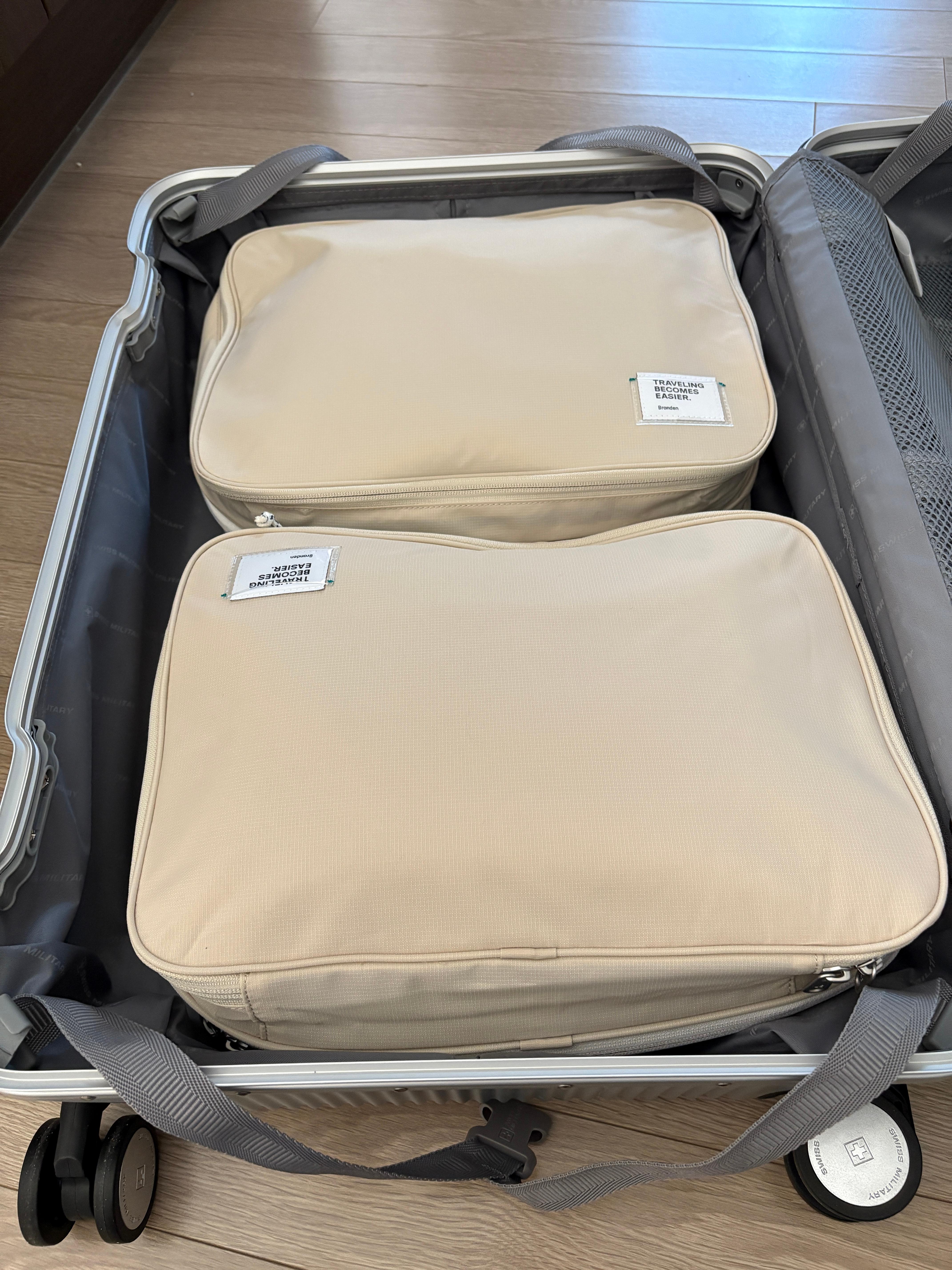 제 26인치 캐리어(스위스밀리터리)에 일단 옷들을 넣지 않고 압축 파우치 구성을 어떻게 해야 할지 우선 넣어보았습니다.