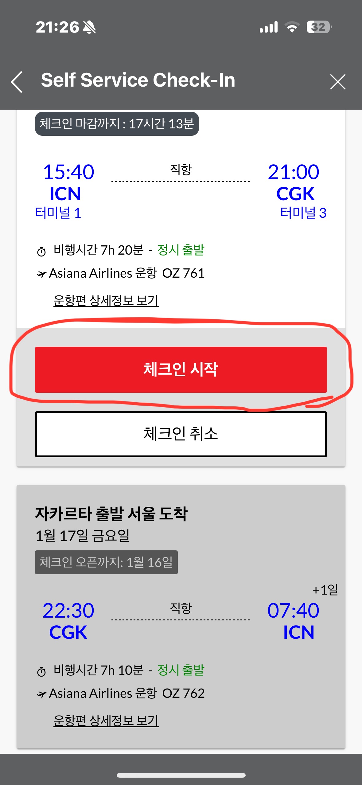 비행 편명과 출도착 시간을 알려주고 [체크인 시작]이라는 버튼을 보실 수 있습니다. 체크인 시작을 누르면
