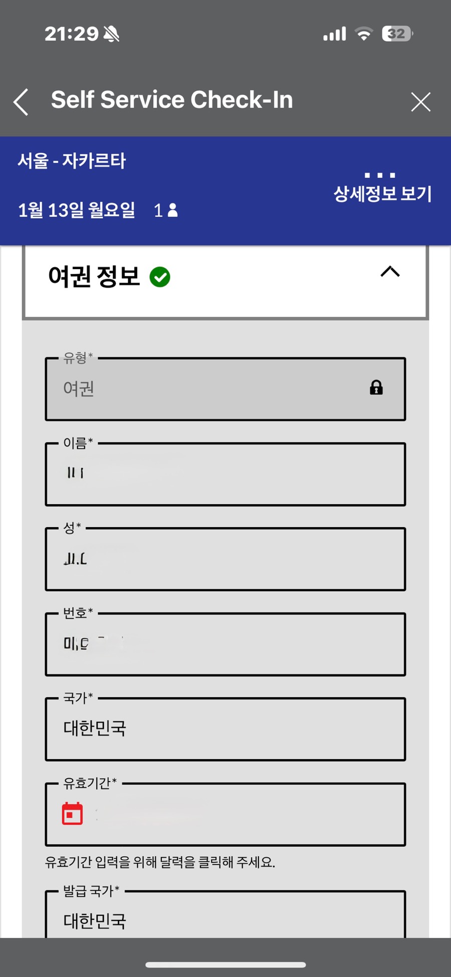세 번째로 여권 정보를 여셔서 이름, 성, 여권번호, 국가, 유효기간을 정확히 입력하시거나 확인하시면 됩니다.