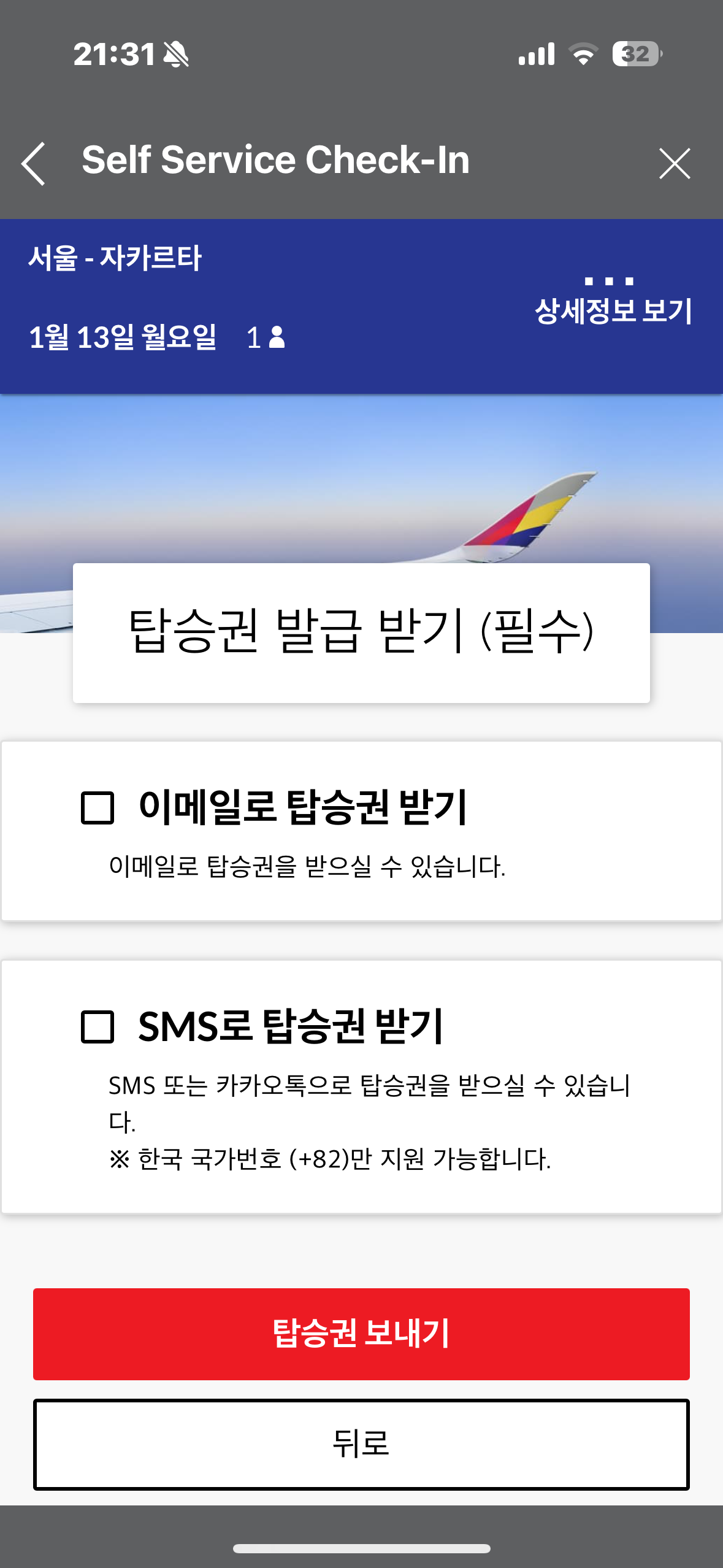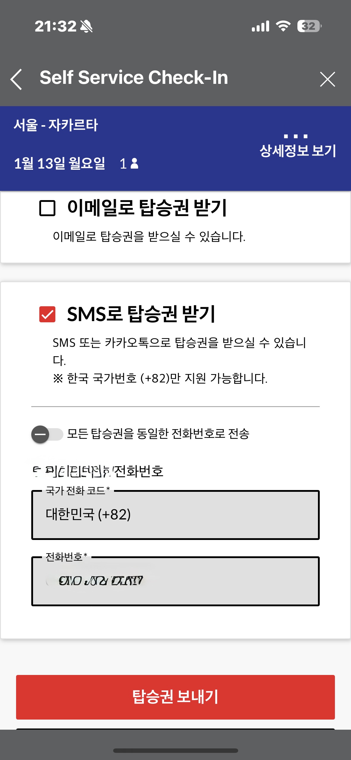 마지막으로 탑승권을 받는 방법을 선택하는데요. 요즘은 스마트폰으로 다 되기 때문에 SMS로 받기를 선택하였습니다.