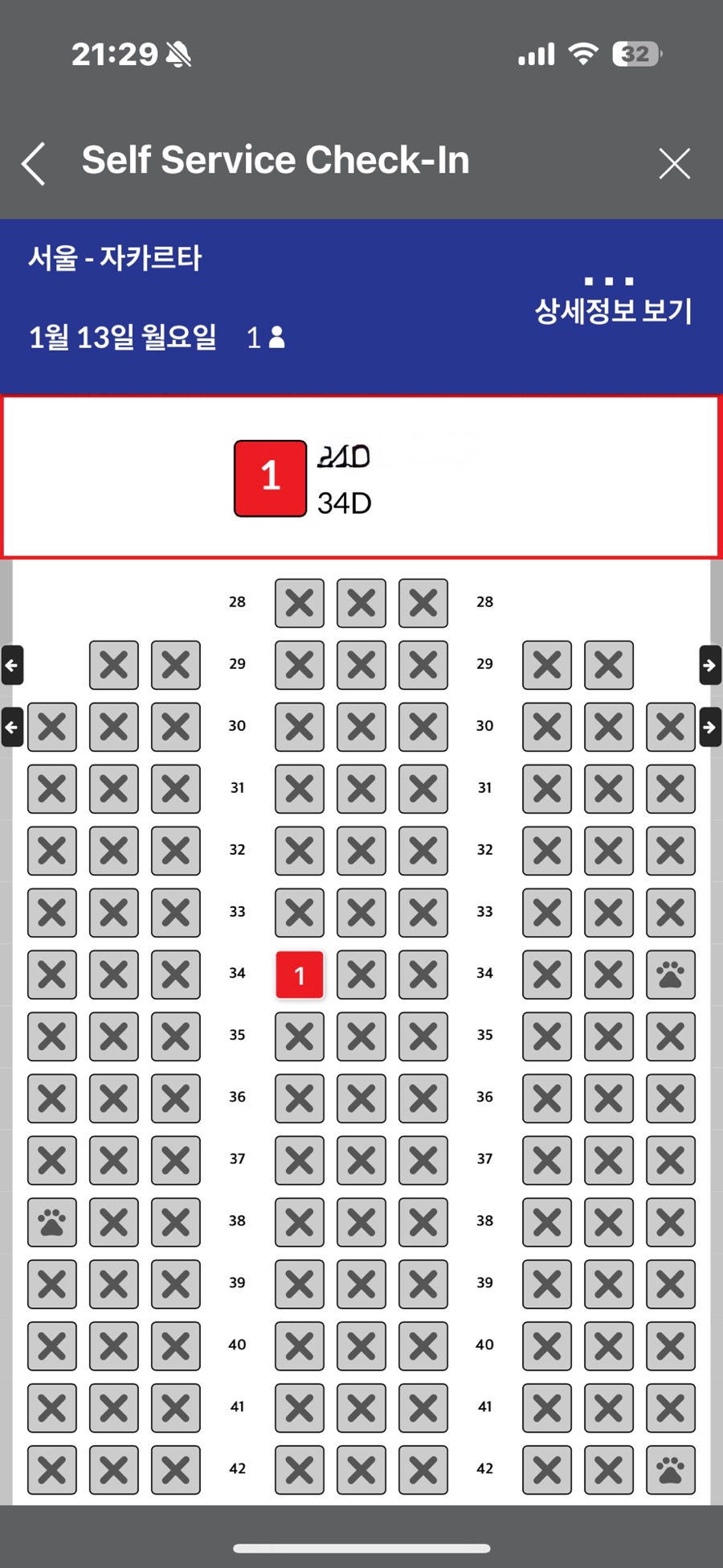 세 가지 내용을 모두 확인하신 후에는 좌석 지정이 가능한데요. 저는 이미 선택 완료되어 자리를 옮길 수는 없었습니다.