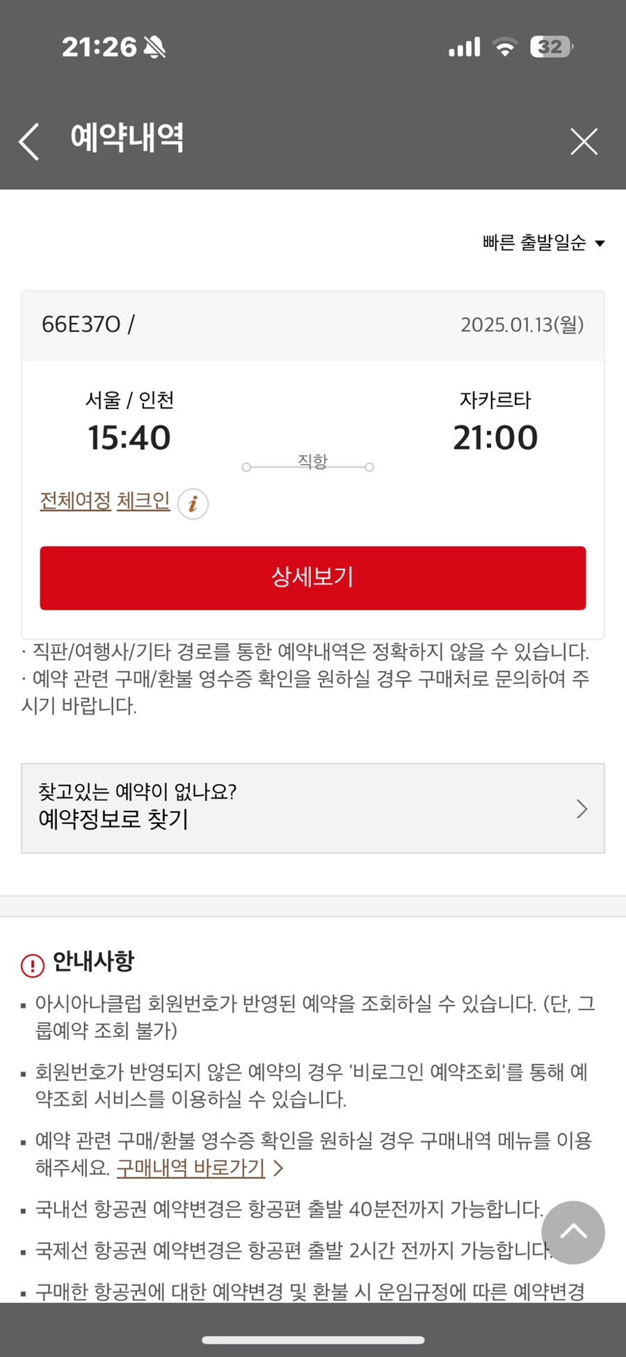아시아나 모바일 앱에서 나의 예약으로 가시면 예약되어 있는 내역을 확인하실 수 있습니다. 상세 보기를 누르시면