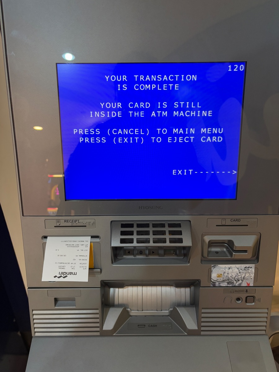 출금 전표(영수증)가 먼저 나오고 카드가 기계 안에 있으니 추가 작업이 필요하면 CANCEL을, 작업을 마치려면 EXIT를 누르라는 안내가 나옵니다. 저는 더 할 작업이 없기에 EXIT를 눌렀습니다.