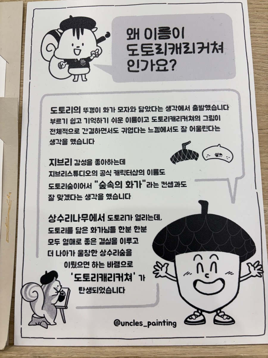 저희 차례가 와서 자리에 앉으니 왜 도토리인지 설명되어 있는 종이를 볼 수 있었습니다. 저희를 그려주신 작가님도 도토리를 닮은 모자를 쓰고 계시더군요^^