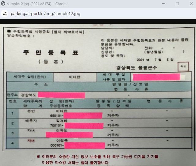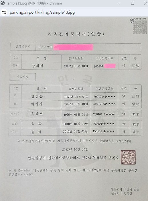 그리고 주민등록등본 또는 가족관계증명서를 업로드해야 하는데, 그것도 샘플로 대신 안내드립니다.