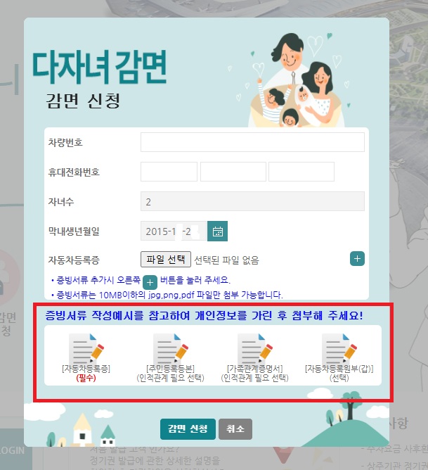 하단에 증빙서류에는 개인정보를 가린 후 첨부해 달라고 하는데, 사실 좀 아쉬웠습니다. 이미 행정정보공동이용으로 자녀수가 2명인 것도 알고 있고, 막내 생년월일까지 알고 있는 상황인데. 그걸 또 마스킹 작업을 해서 업로드를 해야 한다니 왠지 불필요하지 않나 싶긴 했습니다. 하지만 서류가 중시되는 우리나라 행정업무 특성상 필요한 업무겠지라고 생각했습니다. 나중에는 개선이 되었으면 합니다.