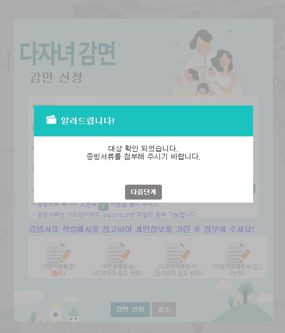 제 이름과 주민등록번호를 입력되어 있는 상태에서 대상확인 버튼을 누르니 다자녀 감면 대상이라는 확인이 바로 뜨고 다음 단계로 넘어가도록 안내되었습니다. 이런 행정정보공동이용은 아주 마음에 듭니다.