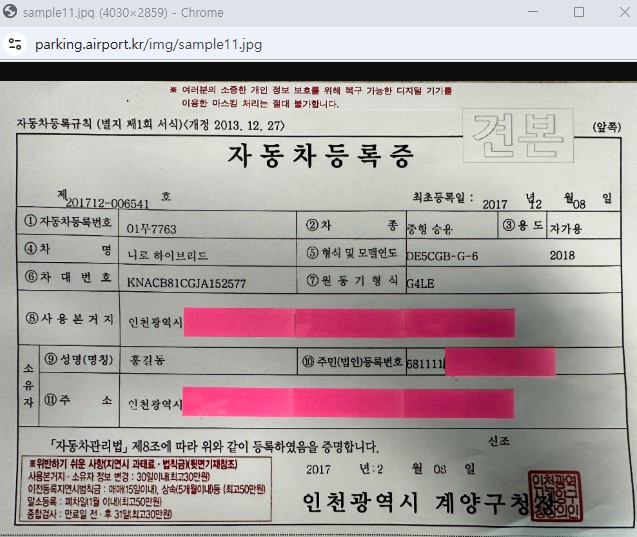 필수로 되어있는 자동차 등록증 샘플을 보았습니다. 제 것을 보여드릴 수 없어서 샘플로만 보여드립니다.