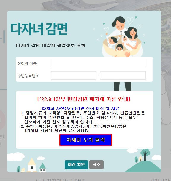 감면 신청을 누르면 위와 같이 신청자 이름과 주민등록번호를 입력하도록 되어있습니다. 신청자가 다자녀 감면 대상이 되는지 아닌지 사전에 알아볼 수 있도록 만들어 놓아 헛수고를 하지 않아도 되는 것이 마음에 들었습니다.