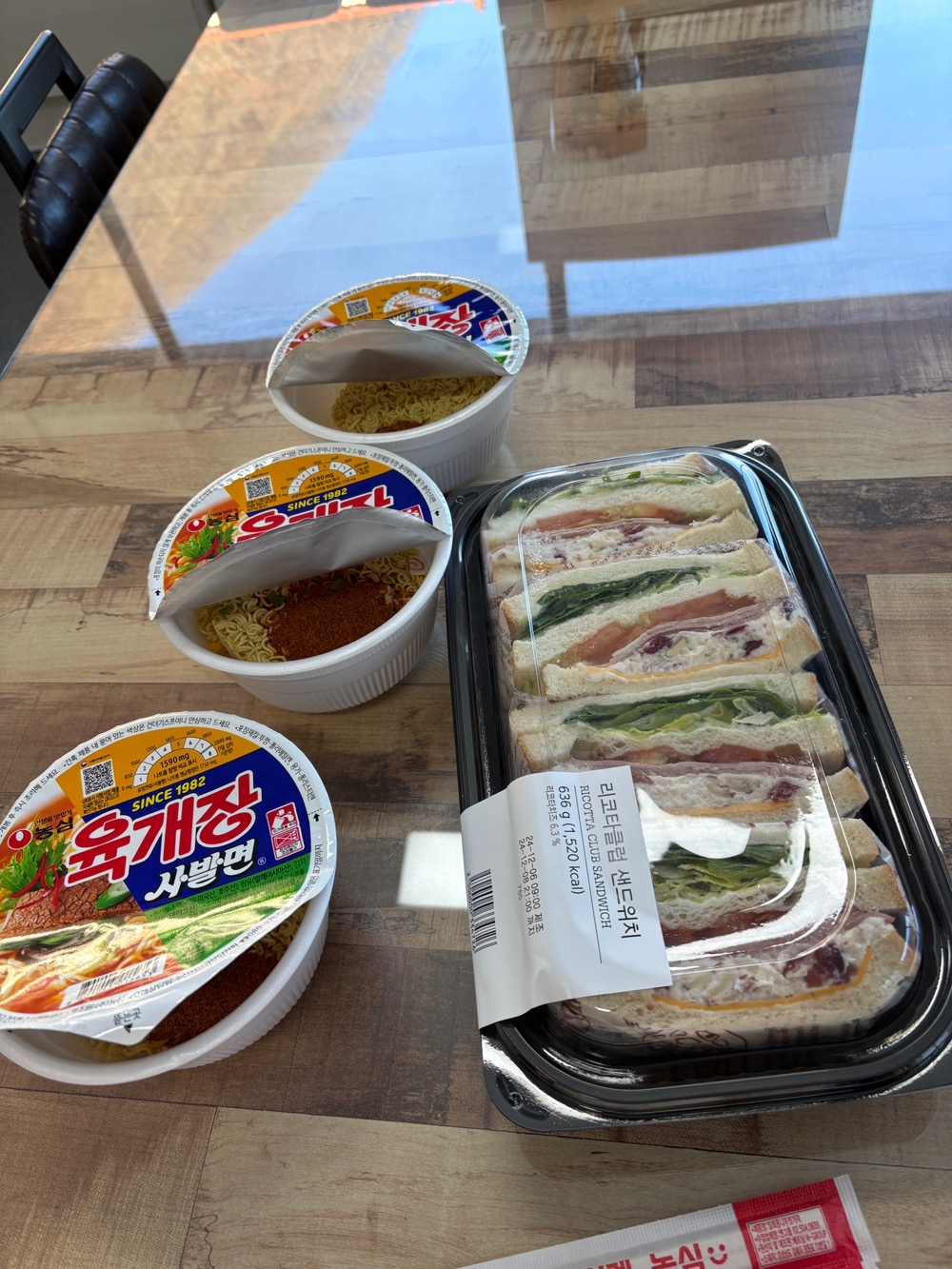 숙소 도착 후 늦은 점심은 사발면과 샌드위치!
