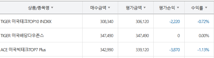 IRP를 10월부터 시작하면서 함께 알게 된 개인종합형 자산관리계좌(ISA)에도 2024년 12월에 우선 1백만 원을 투자해 보았습니다. ISA는 3년 만기임에 따라 상여금 등 갑자기 생기는 여유돈을 묶어놓으려 만들어 보았습니다. 제 ISA 계좌 포트폴리오는 다음과 같습니다.TIGER 미국테크TOP10 INDXXTIGER 미국배당다우존스ACE 미국빅테크TOP7 Plus IRP에는 안전자산과 위험자산으로 나뉘어서 투자를 할 수 있지만, ISA 계좌는 공격적인 투자를 위해 테크 위주의 포트폴리오를 구성해 보았습니다. 2025년 1월 2일 투자 현황은 다음과 같습니다. IRP 포트폴리오와 비교했을때 ISA에 담은 테크주는 확실히 등락이 심한 걸 알 수 있었습니다. 얼마 전까지 다 빨간불이었는데 어느 순간 파란..